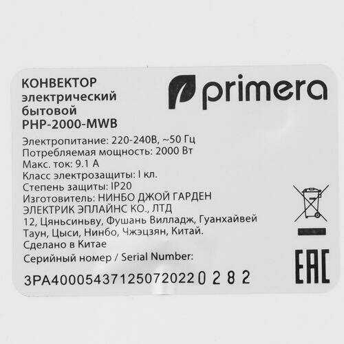 Отзывы о Электрический конвектор PRIMERA PHP-2000 (PHP-2000-MWB)