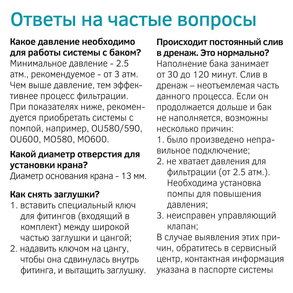 Надёжность конструкции и возможные проблемы: Качество сборки и материалов в целом оценивается положительно, однако встречаются отдельные случаи производственного брака, в частности неработающие обратные клапаны мембраны. Пользователи сообщают о вибрации четырёхходового клапана и возможных протечках в местах соединений, особенно при недостаточно глубокой заправке трубок в фитинги (менее 8 мм). Накопительный бак демонстрирует реальную полезную ёмкость 6-7,5 литров, хотя некоторые пользователи сталкиваются с уменьшением отдачи до 1,5 литров. Пластиковые соединения могут передавливать трубки при чрезмерной затяжке, создавая риск разрыва при гидроударе. Уплотнительные кольца в колбах выдерживают 3-4 цикла замены картриджей, после чего требуют замены. Система совместима с бустерными насосами для повышения производительности при низком давлении в магистрали.