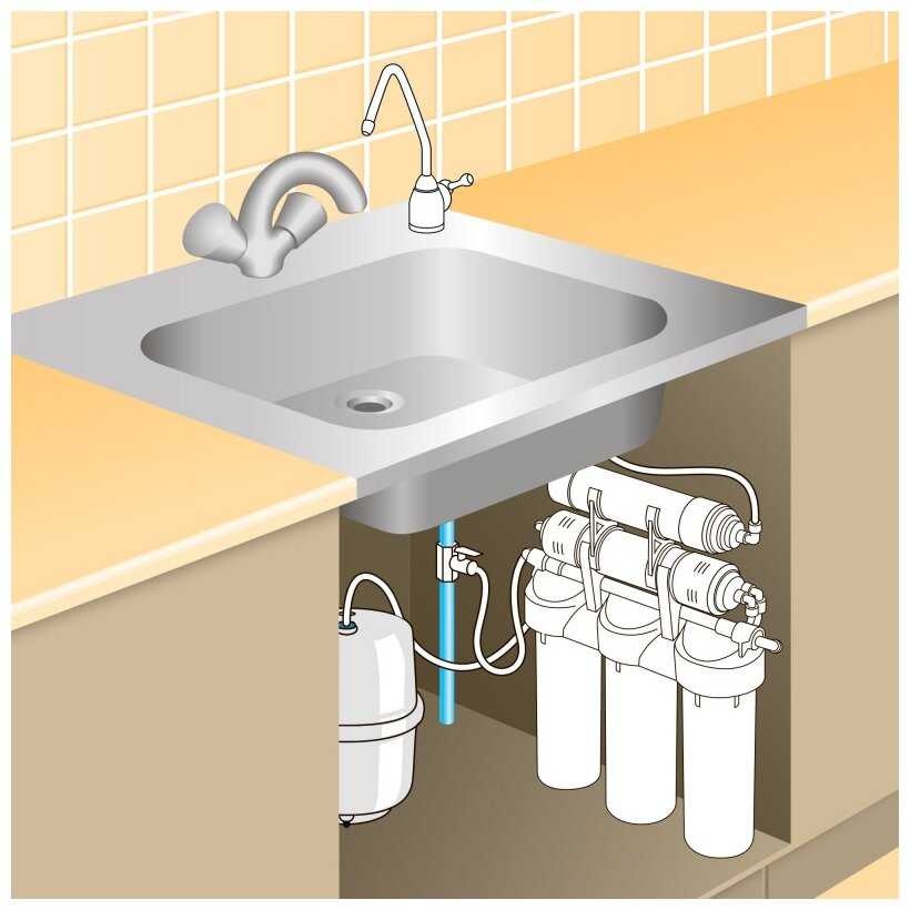 - Ставится под мойку с отдельным краном, не мешает на столе.