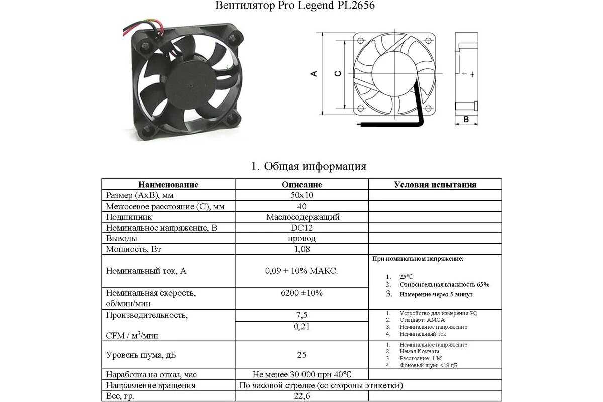 Характеристи PRO LEGEND Осевой вентилятор (50x50x10 мм, 6200 об./мин, 12 В)