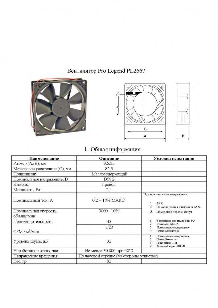 Характеристи PRO LEGEND Осевой вентилятор (92х92х25 мм)