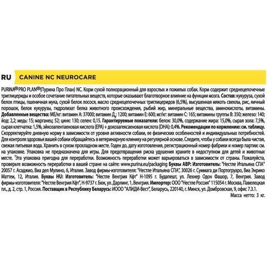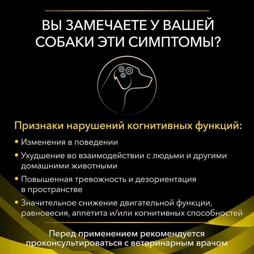 Дополнительная информация : | разработано для поддержания когнитивной функции у пожилых собак. среднецепочечные триглицериды обеспечивают клетки головного мозга альтернативным источником энергии, перед использованием и увеличением периода кормления сверх рекомендованного проконсультируйтесь с ветеринарным врачом, следите чтобы у собаки всегда была чистая питьевая вода |