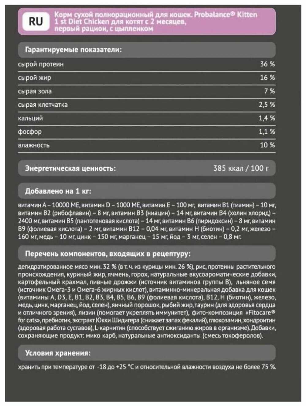 | Дополнительная информация : | у котенка всегда должен быть доступ к свежей питьевой воде, размер гранулы: диаметр - 5 мм толщина - 5 мм |