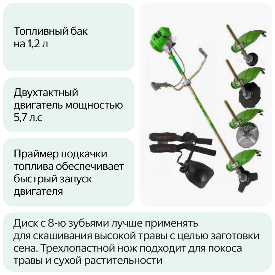 Аппарат после моей полуторной стиги, просто космос,мощности хватает на самую густую траву,за полтора часа участок в шесть соток(минус дом) был облагорожен, впечатления положительные, попробовал все насадки, для травы самая эффективная леска, но кусторез с побетитовыми наконечниками и лепестками среза тоже очень понравилась👍💪🏻