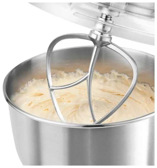 В комплектации с прибором имеются насадки для взбивания и приготовления теста. Прозрачная крышка чаши с загрузочным отверстием позволяет добавлять продукты в процессе смешивания. Это универсальное устройство, при помощи которого можно взбивать, смешивать, измельчать продукты, а также приготовить фарш. Он сделан в алюминиевом корпусе и оснащен долговечным металлическим редуктором. Благодаря электронному регулятору с 6 скоростными режимами можно плавно настраивать интенсивность работы.