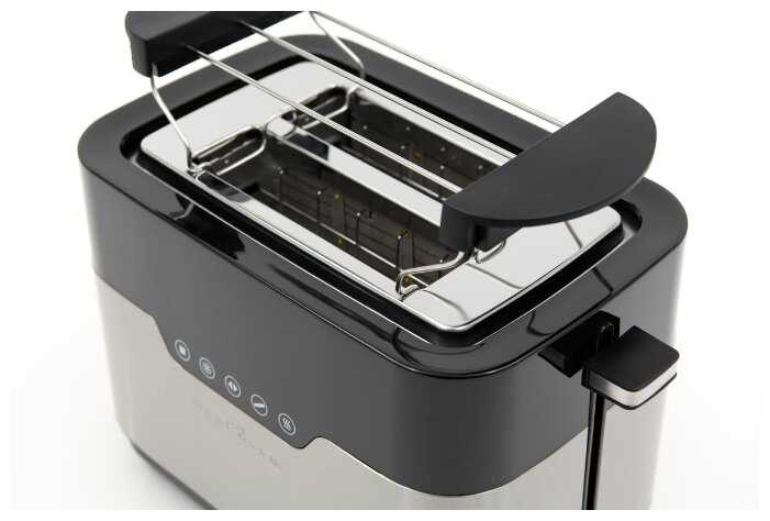 - + Отличный тостер, красивый внешний вид, прожаривает хлеб равномерно. Есть поддон для крошек.