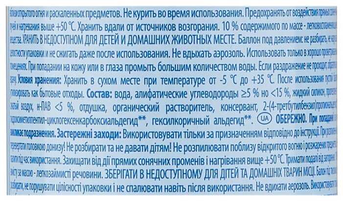 Способ применения : | хорошо встряхните баллон, распылите с расстояния 15см на поверхность и протрите мягкой чистой тканью. Для чистки небольших предметов, панелей телевизоров, видеоаппаратуры или труднодоступных участков распылите на ткань и протрите |