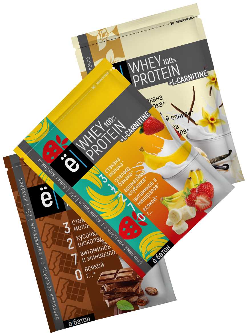 Ё|батон Белковый коктейль + L-Carnitine, (ванильное мороженое, шоколад, банан-клубника) 9 пакетов по 25г