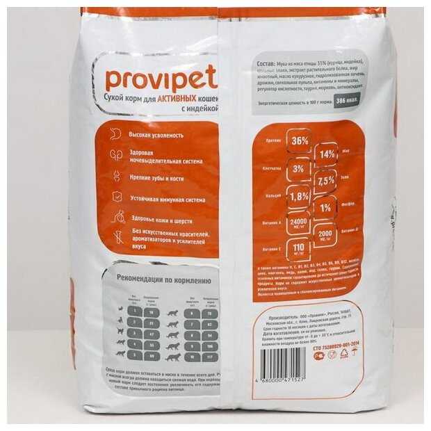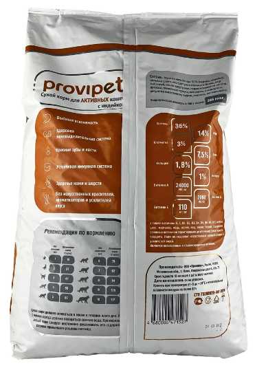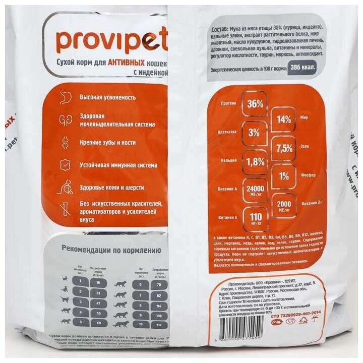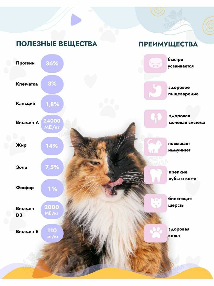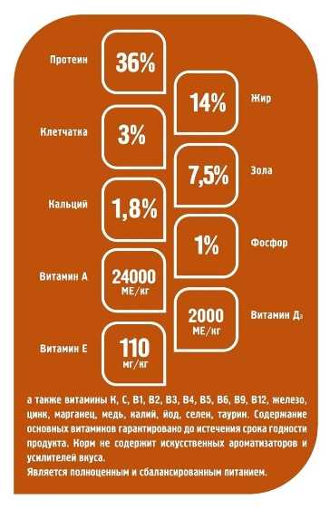 Дополнительная информация : | Гарантируемые показатели: белок 36% жир 14% клетчатка 3% зола 75% кальций 18% фосфор 1% Витамин А 24000 МЕ/кг, Витамин Д3 2000 МЕ/кг, Витамин Е 110 мг/кг а также витамины В4 В3 С В1 В5 В2 В6 В9 К3 В7 В12, минералы: калий железо цинк марганец медь йод селен, таурин. |