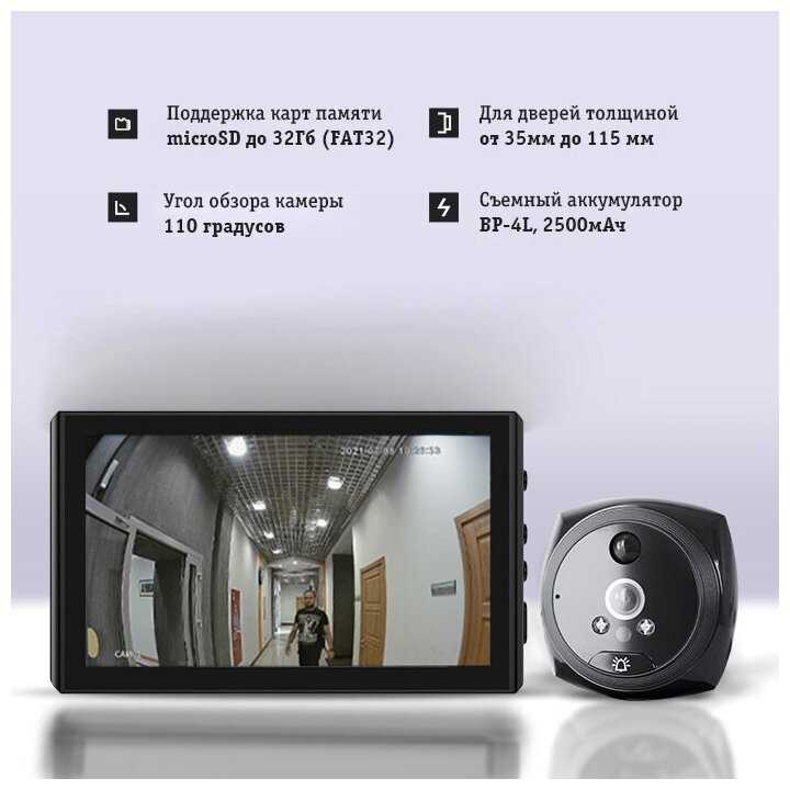 | Дополнительная информация : | запись видео по датчику движения, оснащён ИК-подсветкой, поддержка карт памяти microSD емкостью до 32 Гб, функция автоматического отключения дисплея, возможность записи фото вручную, универсальный крепеж для разных дверей толщиной от 35 до 115 мм |