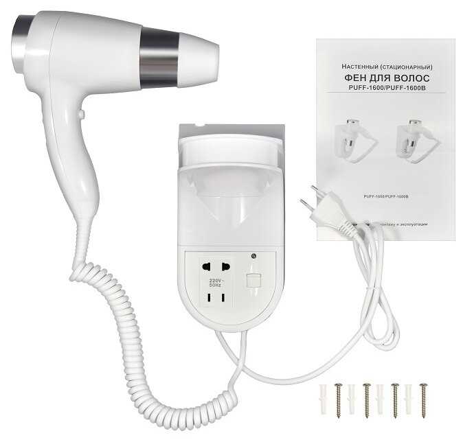 Мы приобретали именно настенный фен в квартиру, которую мы сдаем. Откровенно говоря, так меньше риск, что его кто-то захочет унести с собой в качестве своеобразного сувенира. Он нормально сушит волосы, я тестировала на себе лично. Есть возможность пользоваться и холодным воздухом тоже, то есть присутствуют все привычные функции. Фен весит примерно 1 кг, или там немного меньше. Корпус имеет белый цвет, и он сделан из пластика. Есть скрытое крепление.
