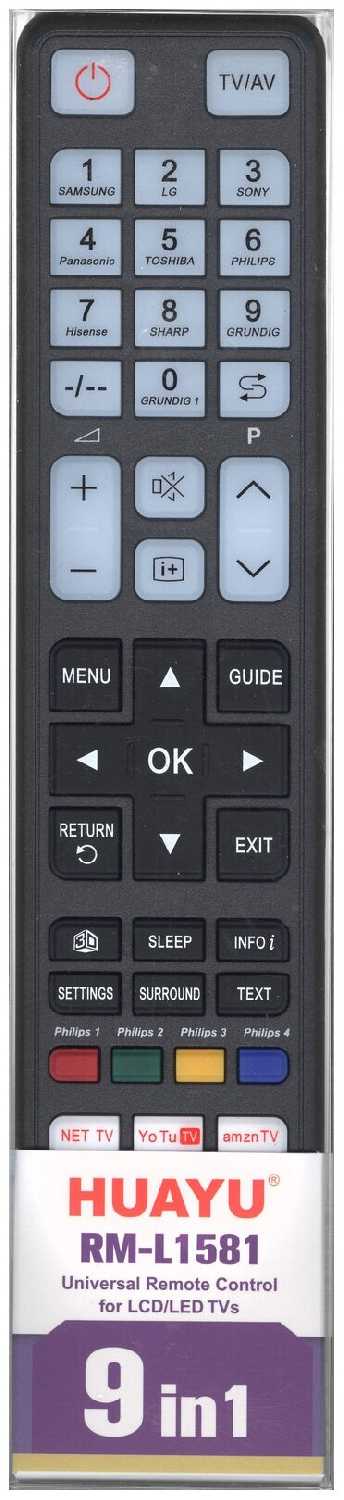 6.2/10 балловHuayu Универсальный пульт RM-L1581 для телевизоров Samsung, LG, SONY, Panasonic, Toshiba, Philips, Hisense, Sharp, Grundig
