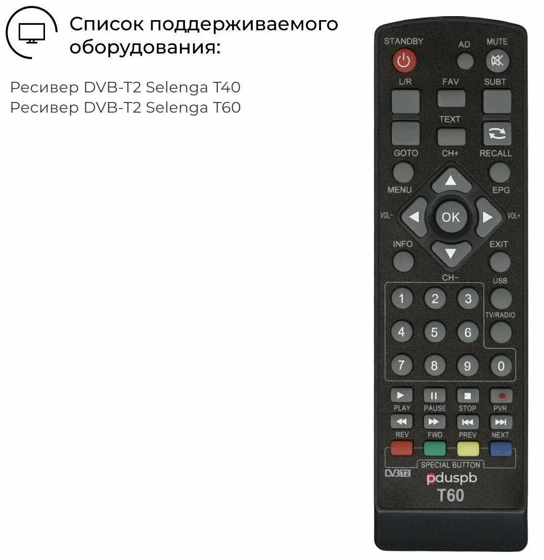 - назначение: для Пульт для приставки / ресивера Selenga: DVB-T2 T40