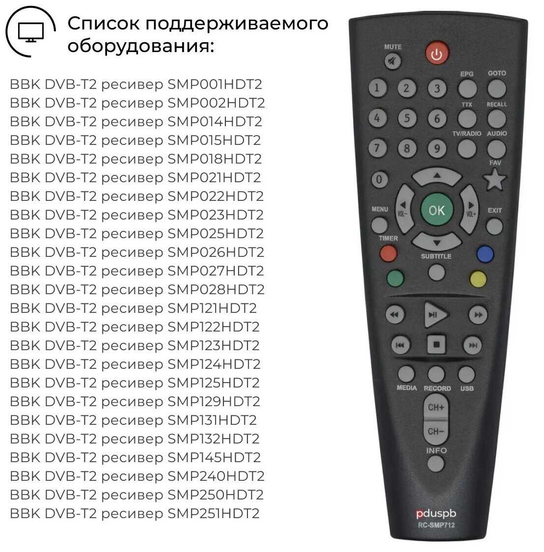 - назначение: для BBK DVB-T2 ресивер : SMP001HDT2; SMP002HDT2; SMP014HDT2; SMP015HDT2; SMP018HDT2; SMP021HDT2; SMP022HDT2; SMP023HDT2; SMP025HDT2; SMP026HDT2; SMP027HDT2; SMP028HDT2; SMP121HDT2; SMP122HDT2; SMP123HDT2; SMP124HDT2; SMP125HDT2; SMP129HDT2; SMP131HDT2; SMP132HDT2; SMP145HDT2; SMP240HDT2; SMP250HDT2; SMP251HDT2;