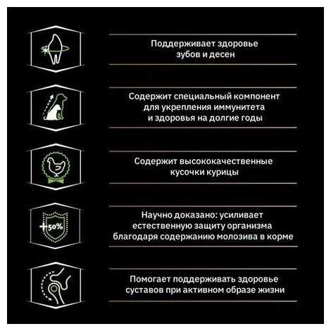 Особые потребности : | для активных животных, для беременных/кормящих, для здоровья кожи и блеска шерсти, для здоровья костей и суставов, для ухода за ротовой полостью, при склонности к избыточному весу |