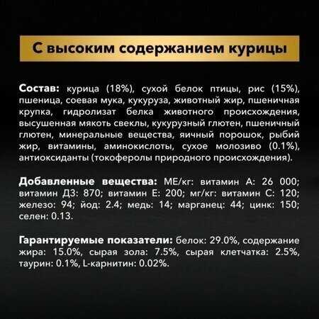 Дополнительная информация : | кормление во время беременности и лактации: проконсультируйтесь у ветеринара, кормление в период роста: с 3 по 6 неделю начинайте давать размоченный корм PRO PLAN® 3–4 раза в день, после полного прекращения кормления материнским молоком кормите согласно таблице, по достижении трехмесячного возраста постепенно снижайте количество воды добавляемой для размачивания корма, поддержание оптимальной массы тела очень важно для здоровья вашего щенка, рекомендуемая суточная норма может варьироваться в зависимости от уровня активности физических особенностей и индивидуальных потребностей вашего щенка, следите чтобы у собаки всегда была чистая свежая питьевая вода, для контроля здоровья вашей собаки обращайтесь в ветеринарную клинику на регулярной основе |