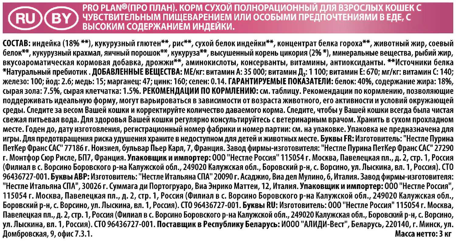 Характеристи Purina Pro Plan Pro Plan с чувствительным пищеварением, с индейкой