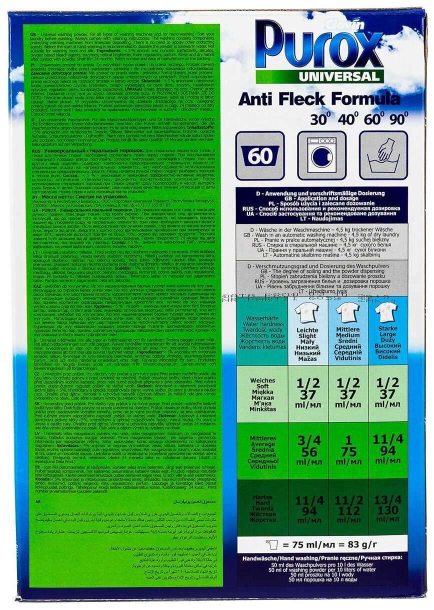 | Способ применения : | стирка в автоматических стиральных машинах (на 45 кг белья) в мягкой воде – 37 мл в средней воде – 56–94 мл в жесткой воде – 94–130 мл, при ручной стирке 50 мл на 10 л воды при температуре 60°C |