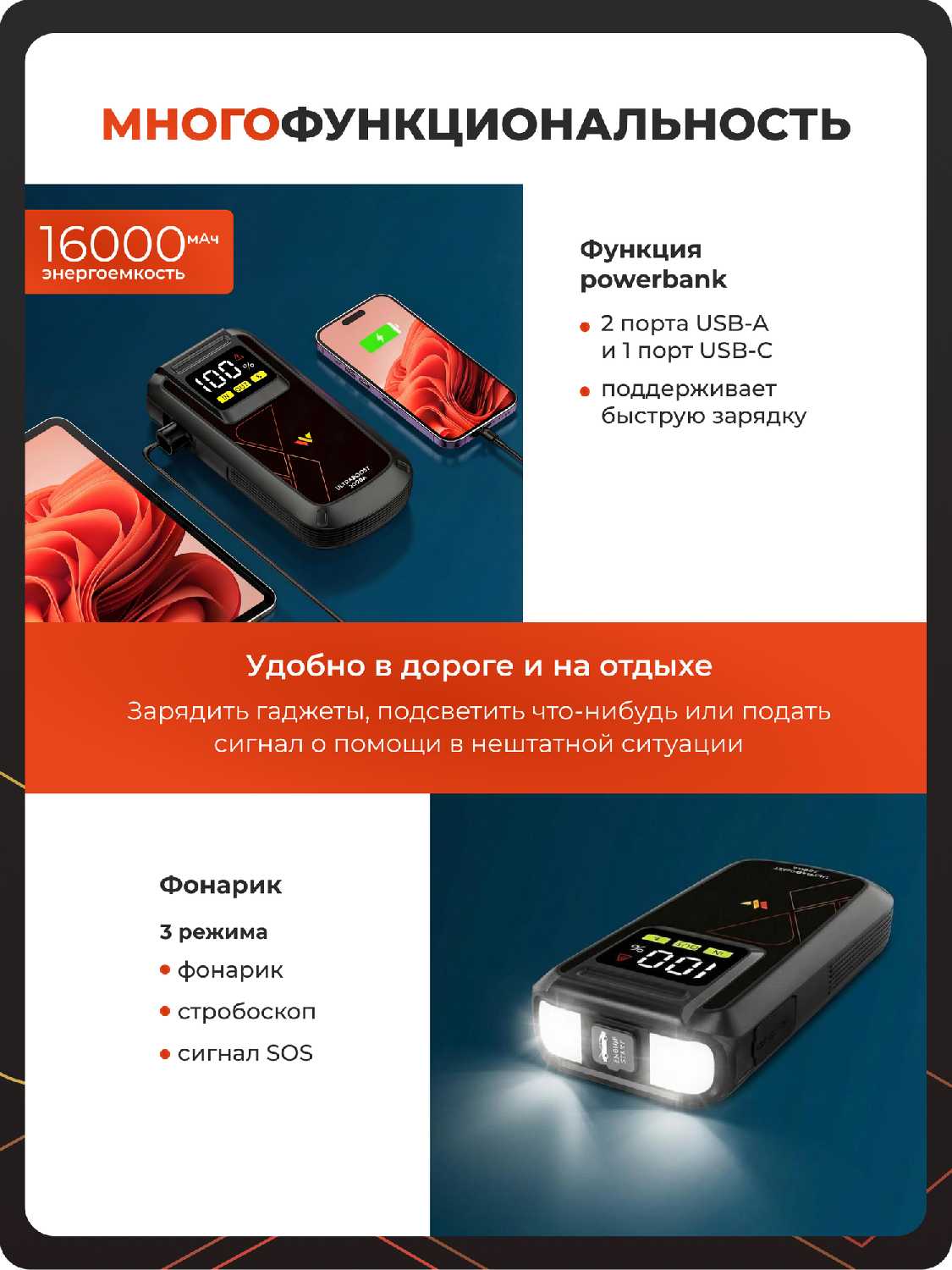 - Универсальный помощник. И машину запустит и телефон зарядит. Сам разряжается долго, так что хватает на несколько раз.