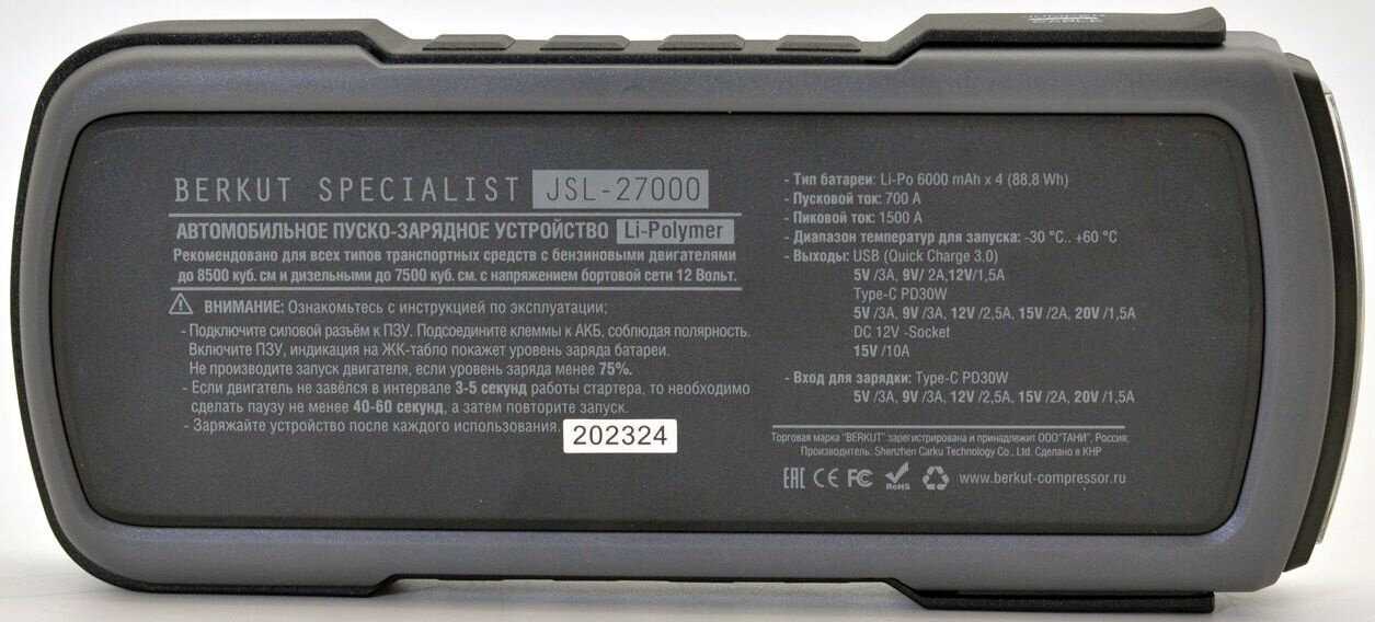 Характеристики:- тип: пуско-зарядное устройство напряжение АКБ: 12 В минимальный ток пуска 200 А максимальный ток пуска 400 А напряжение питания от сети: 220 В встроенная батарея емкость встроенной батареи 10000 мА·ч встроенный фонарь вес 0.3 кг