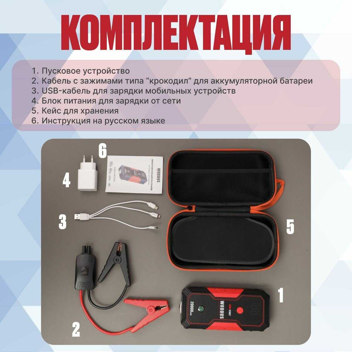 Характеристики:- тип: пусковое устройство напряжение АКБ: 12 В максимальный ток пуска 300 А встроенная батарея емкость встроенной батареи 9600 мА·ч функция зарядки мобильных устройств (Powerbank) встроенный фонарь вес 0.42 кг