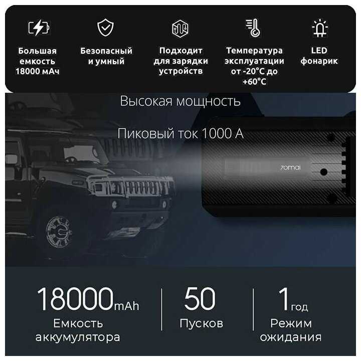 Характеристики:- тип: пусковое устройство напряжение АКБ: 12 В минимальный ток пуска 350 А максимальный ток пуска 700 А встроенная батарея функция зарядки мобильных устройств (Powerbank) встроенный фонарь вес 1.22 кг