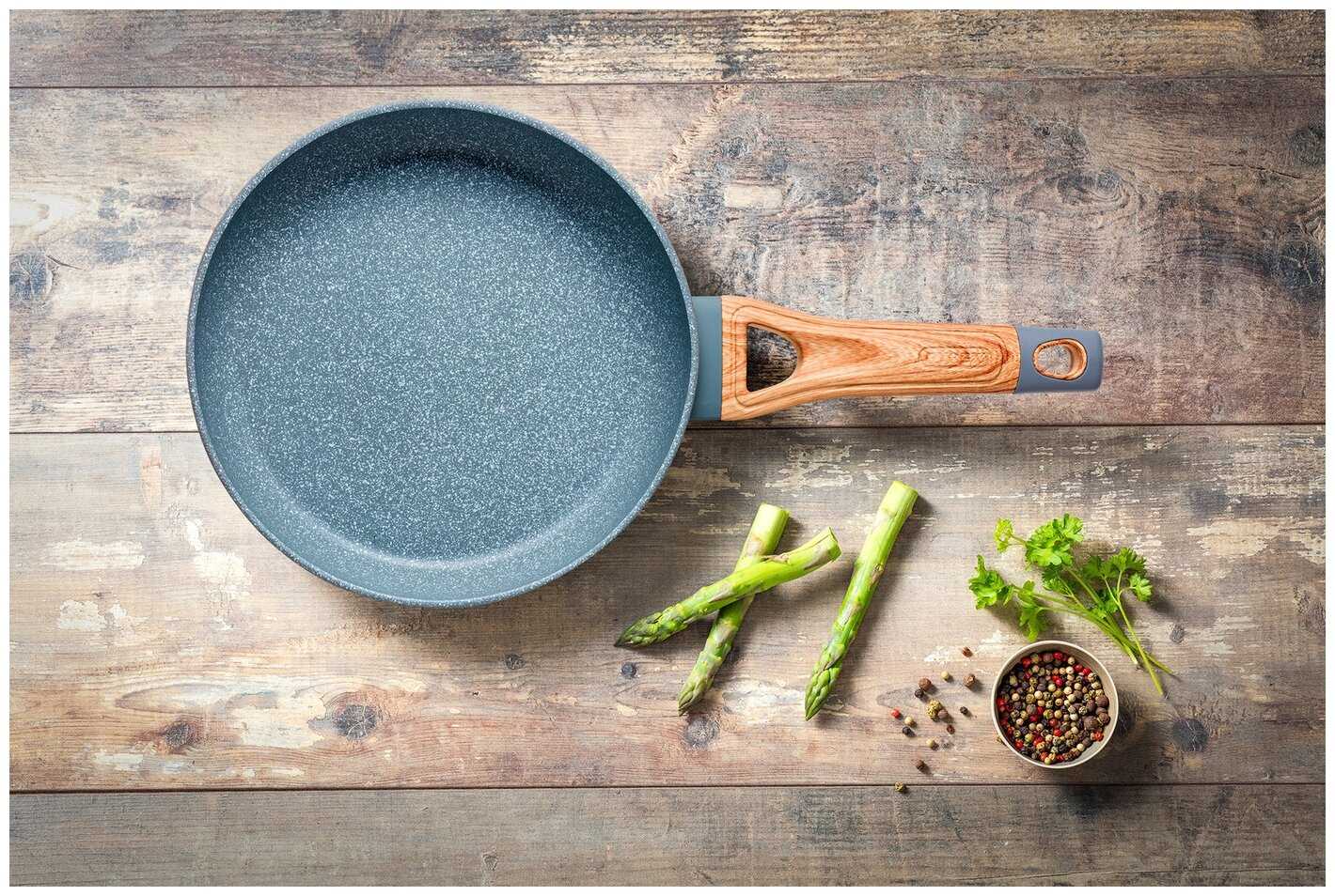 Очень качественная сковорода, покупала по акции. К ней отлично подошла польская крышка Lora 28 см, тоже с бакелитовой ручкой – подошел и цвет, и размер. Надеюсь, при правильном уходе прослужит долго.