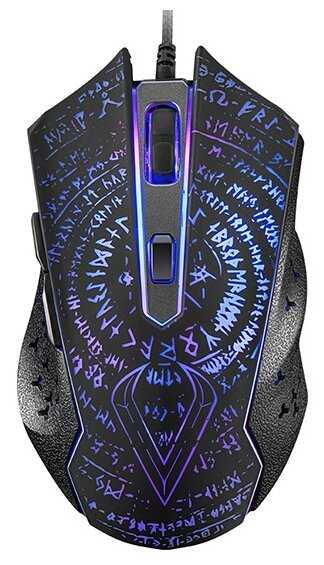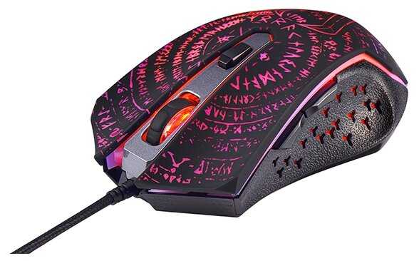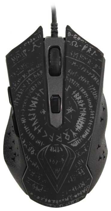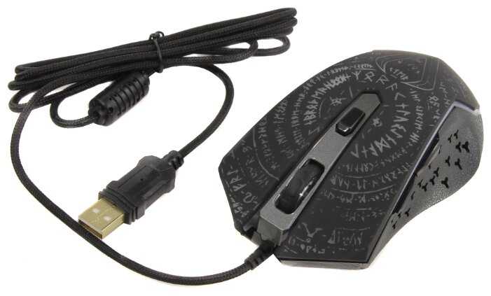 Внешний вид (руническая вязь смотрится просто бесподобно), удобное крепление провода к мышке (по центру, между кликов), удобная форма, мягкое и плавное скольжение по ковру, плетеный шнур.