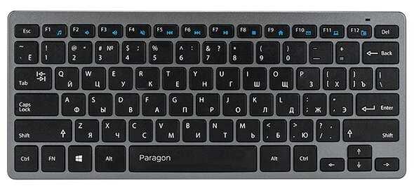 Клавиатура компактная, без цифрового блока, что экономит место на столе. Вместо некоторых привычных клавиш, таких как Print Screen, PgUp/PgDn, Home, End, используются комбинации с клавишей Fn. Например, для создания скриншота в Windows 10 используется комбинация Win+Shift+S. Первое время отсутствие выделенных клавиш может вызывать дискомфорт, но большинство пользователей со временем привыкают. Раскладка — русская и латинская, нанесена качественно, символы хорошо читаются. -