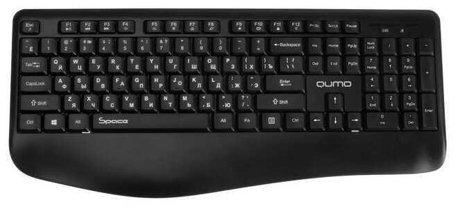 Сразу же порадовало наличие щелочных батареек в комплекте, причем и для клавиатуры, и для мыши требовалась всего одна батарейка. Эргономика клавиатуры оказалась интересной - подставка для запястий большая и имеет выпуклость в середине. Надписи "Space", "Qumo" и обозначения клавиш имели разный цвет и шрифт, но это мелочи. У клавиатуры было четыре резиновые ножки.