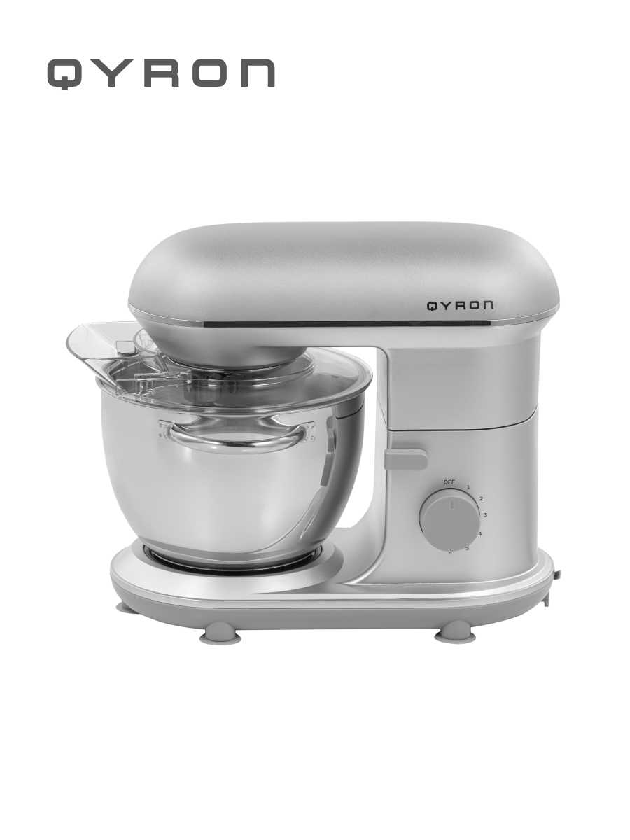 серый корпус без всякого лишнего шума на кухне смотрится великолепно. в комплекте три сменные насадки. т. к пироги я есть люблю, а тесто делать нет, надеюсь что данный аппарат будет хорошим помощником