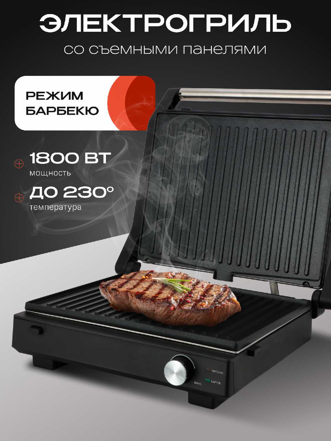 | Особенности : | антипригарное покрытие, поддон для сбора жира, регулировка высоты верхней панели, съемные пластины |