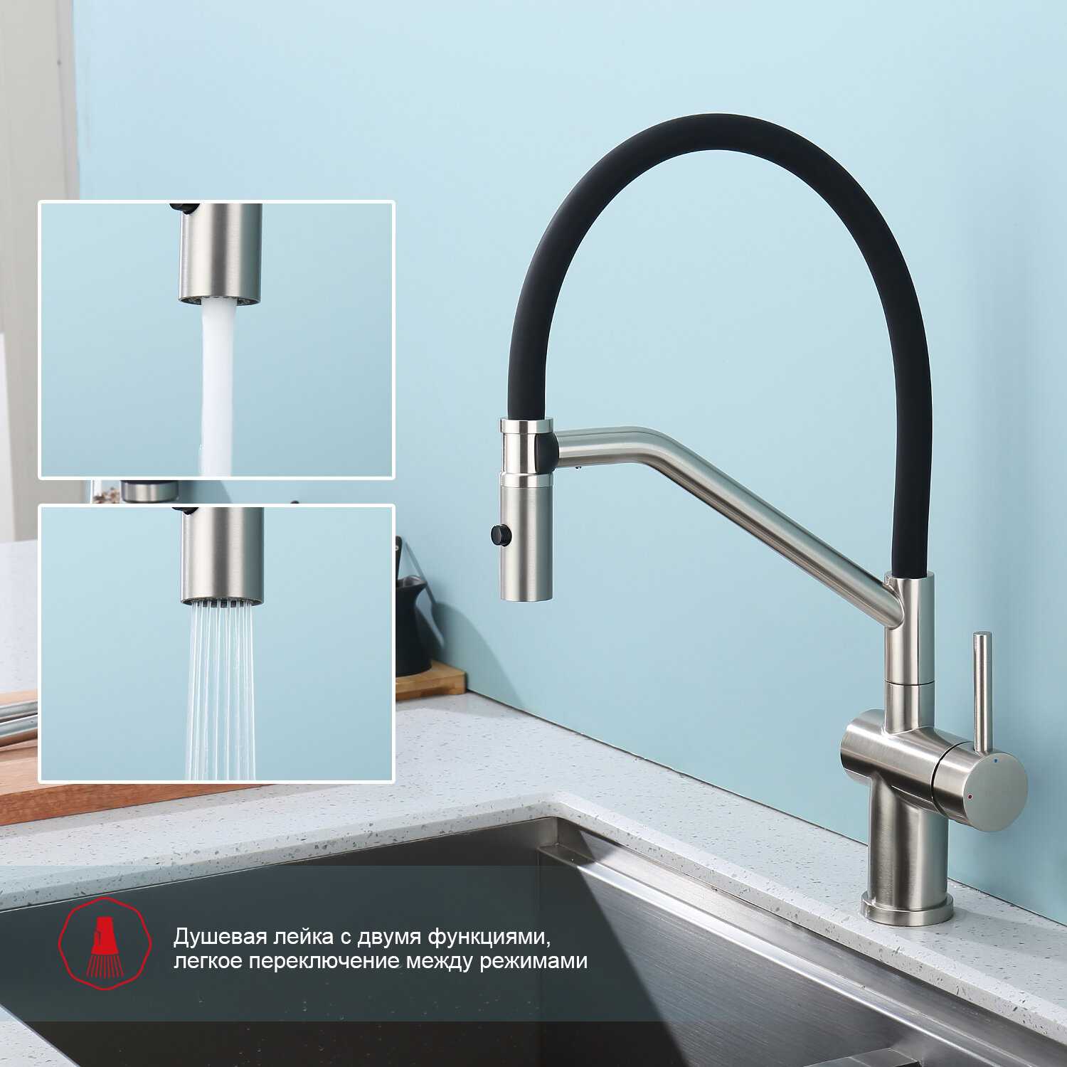 - + Смеситель получился удобным в использовании. Ручка двигается плавно, без рывков. Вода льется ровно, не разлетается по сторонам раковины. Гибкий шланг снимается легко, это реально упрощает дела. Переключение на душ работает без сбоев, всё четко и надежно. Цвет полностью вписался в мою кухню, смотрится гармонично.