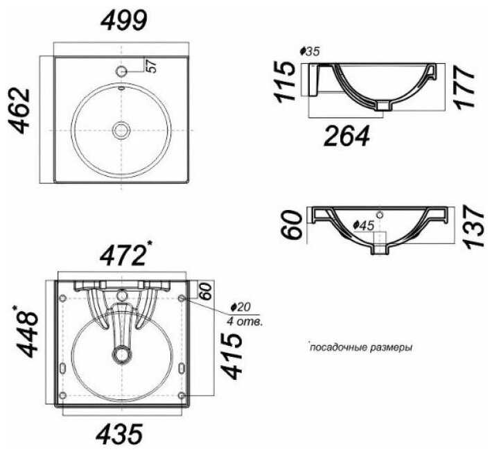 Характеристики:- раковина установка универсальная полукруглая выполнена из фарфора с отверстием под перелив ШхГхВ: 64.70х48.20х20.20 см