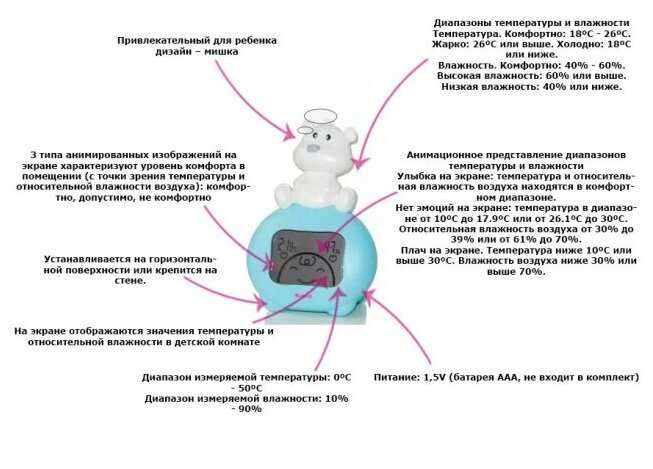 Пользовались обычным термометром, но случайно разбили его. И когда стали искать новый, увидела этот и пришла в восторг от мишутки. Какая оригинальная штука! Еще и влажность показывает. Полугодовалому сынишке тоже нравится, улыбается, ручки тянет. И нестрашно дать ему, потому что никаких острых углов, совершенно безопасный прибор.