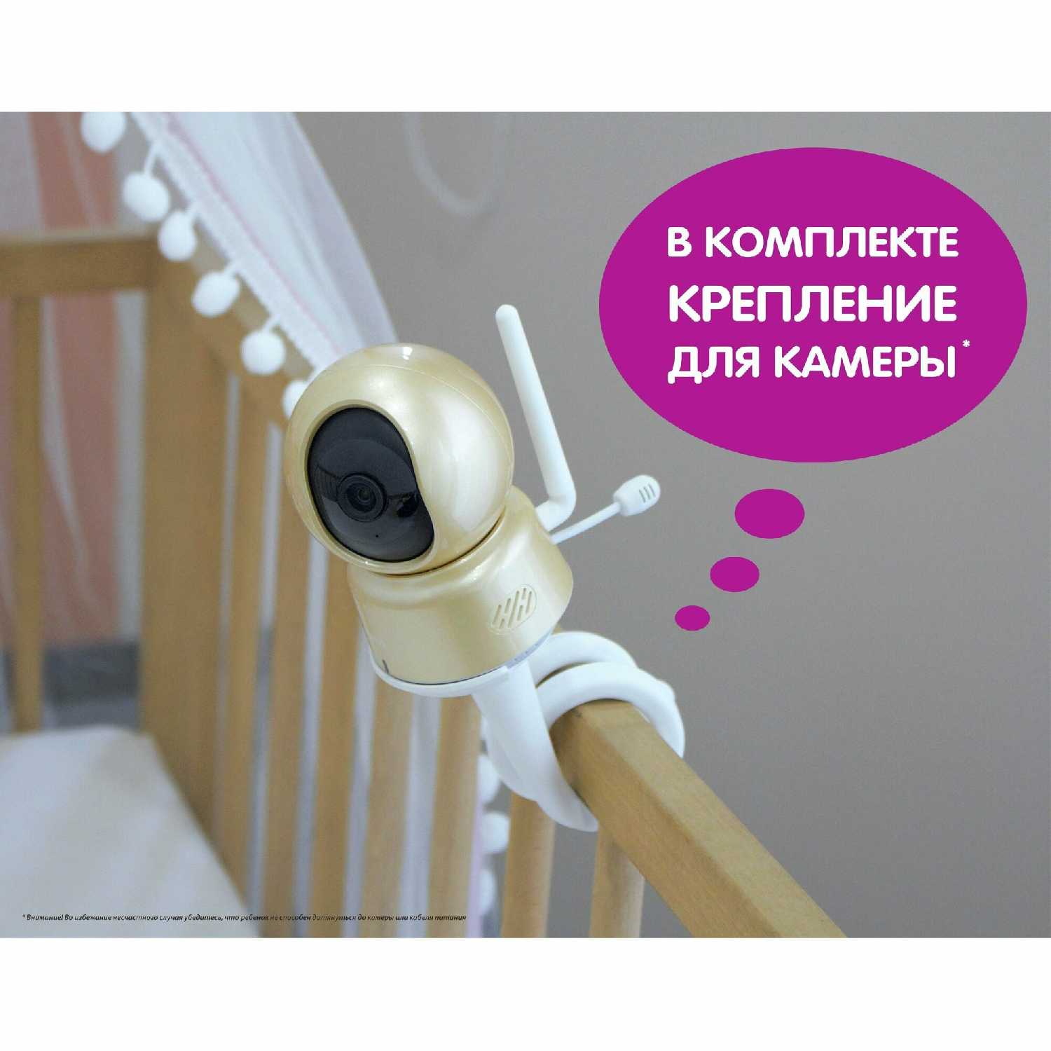 - Универсальное крепление камеры включает гибкий держатель для фиксации на кроватках, колясках и стационарный кронштейн для стен.