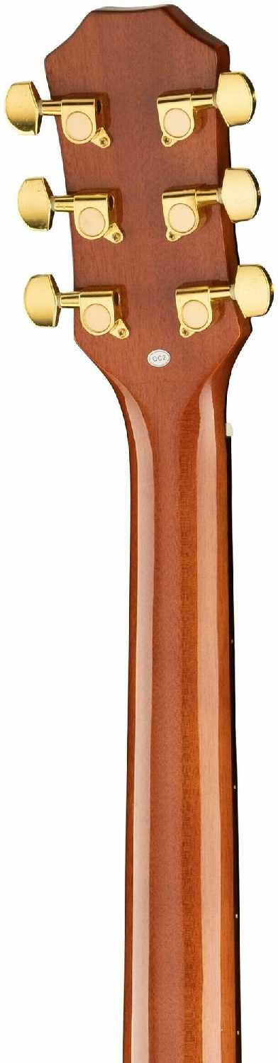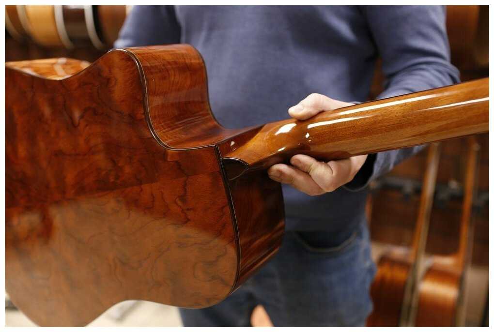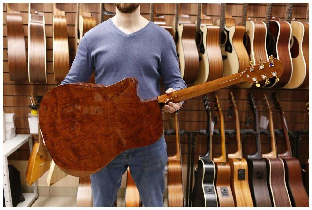 - - лак зацарапаный,похоже на витринный вариант,имеются потеки лака,на накладке грифа на 12 ладу с дефектом,выборка под верхний порожек 4 мм в место 3,поэтому порожек при натяжке струн становится на бок из-за чего Мензура уменьшается и гитара искажает звучание,звучание обычной фанерной гитары,вся гитара из краснухи кроме верхней деки тяжелей обычной, при игре сидя постоянно ползёт назад.