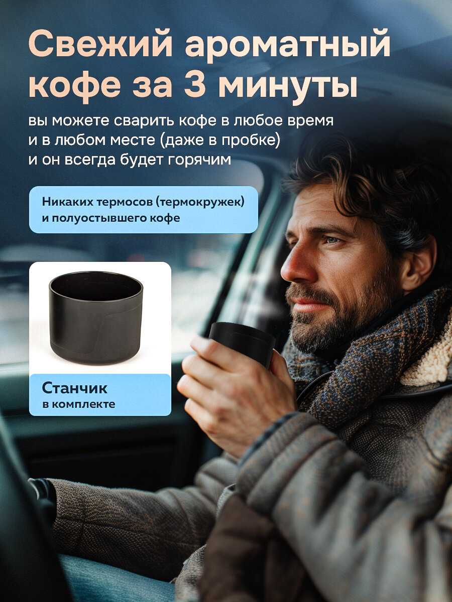 - - 3 минуты нагрев до 98градусов воды, только молотый кофе и капсулы, носить с собой. в дороге затруднительнг почистить от молотого кофе