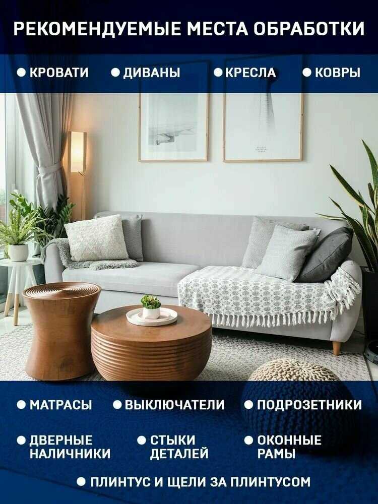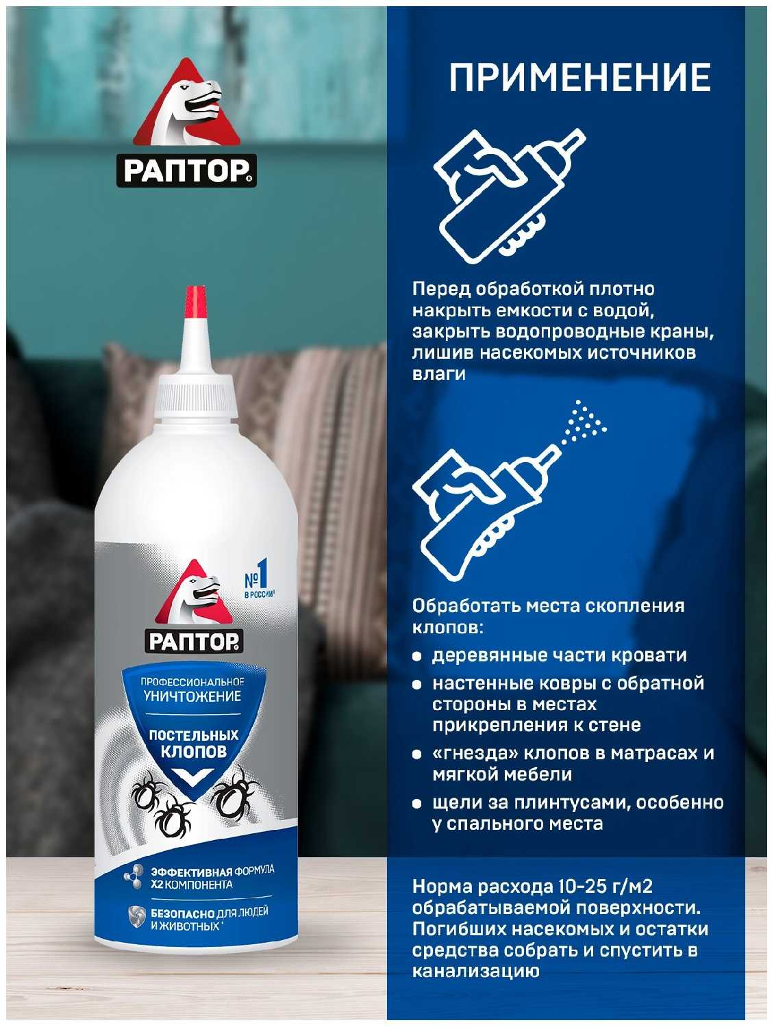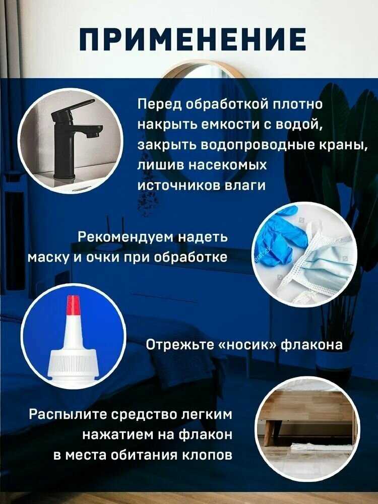 Способ применения : | 1. Перед обработкой плотно накрыть емкости с водой закрыть водопроводные краны лишив насекомых источников влаги, 2. Рекомендуем надеть маску и очки при обработке, 3. Отрежьте «носик» флакона, 4. Распылите средство легким нажатием на флакон в места обитания клопов |