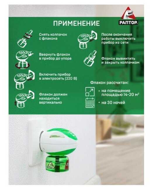 Особенности эксплуатации, конструкция и надежность: Конструкция фумигатора включает поворотную вилку, что позволяет устанавливать прибор как в вертикальные, так и в горизонтальные розетки, обеспечивая необходимый вертикальный position флакона с жидкостью для корректной работы. Корпус устройства выполнен из качественной пластмассы, что отмечается пользователями в сравнении с более дешевыми аналогами. Ключевым эксплуатационным требованием является необходимость расположения устройства непосредственно в розетке, что может потребовать использования разветвителя или сетевого фильтра в случае неудобного расположения розеток в комнате. Прибор в процессе работы нагревается, что является нормальным режимом его функционирования для испарения жидкости, однако некоторые пользователи выражают осторожность и не рекомендуют оставлять его включенным на всю ночь из-за этого фактора. Заявленный срок непрерывной работы одного флакона с жидкостью составляет до 45 ночей, однако на практике этот показатель может варьироваться в зависимости от модели и условий использования. Встречаются единичные сообщения о выходе из строя самого корпуса фумигатора после полутора-двух месяцев активного использования, что может указывать на потенциальный предел надежности электронного компонента. Большинство же пользователей не отмечают проблем с надежностью и используют устройство на протяжении нескольких сезонов.