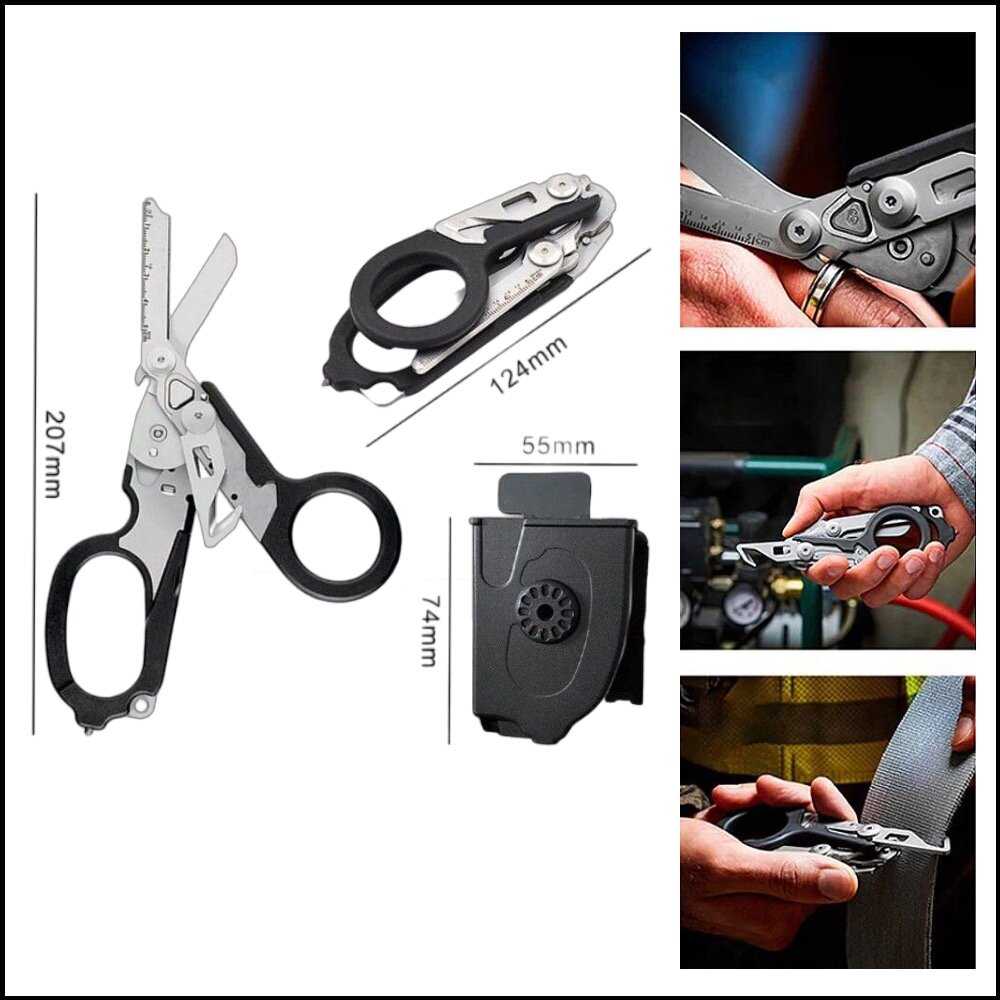 - + Хороший так сказать мультитул, в наличии стропорез, сами ножницы со складными ручками. Фиксирующиеся ручки. Стеклобой.