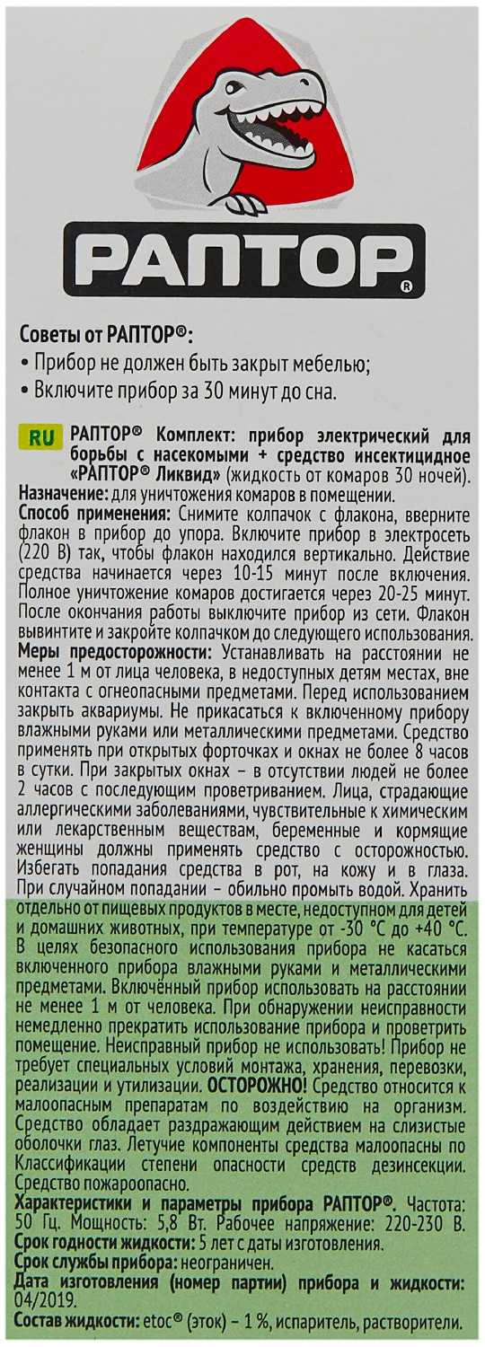 Я всегда за честный отзыв. Этим летом комары в квартире достали. Решил купить фумигатор. Бренд Раптор вроде на слуху , решил попробовать. К прибору нареканий нет - собрано качественно, комплект соответствует заявленному в описании, всё красиво. НО, комары просто смеются над этим прибором. Они летают над ним, спят над ним на потолке, причем группами. Что интересно , мухи дохнут ) Комарам вообще параллельно, ощущение, что им эта штука даже нравится )))