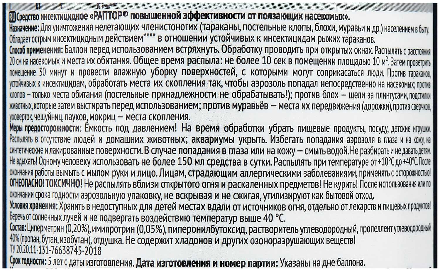 | Состав : | циперметрин, имипротрин, пиперонилбутоксид, растворитель углеводородный, пропеллент, отдушка |