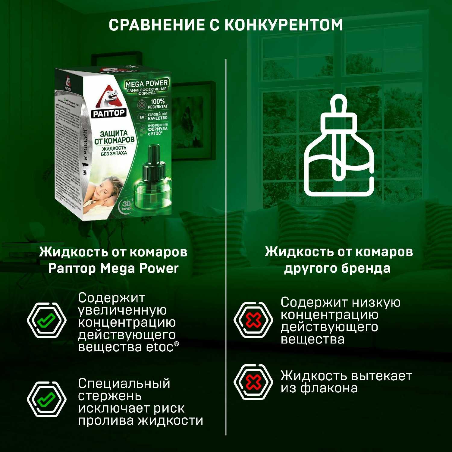 Жидкость значительно эффективнее пластин — комары на пластины не реагируют и продолжают летать, а на жидкость умирают быстро. Она экономичнее за счёт большего срока службы одного флакона. Пользователи предпочитают именно жидкость Раптор за надёжность и отсутствие реакции насекомых.