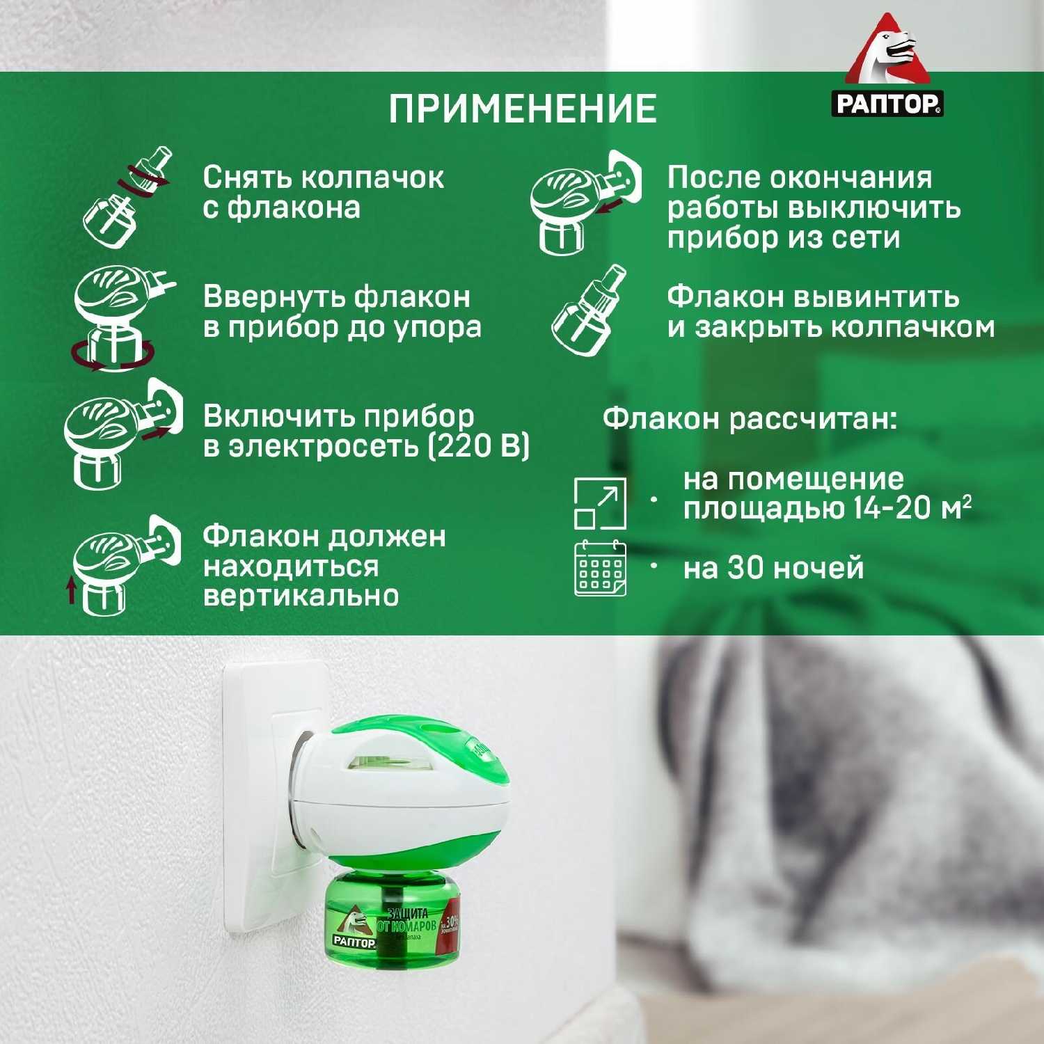 - Комары перестают летать и кусаться через короткое время после включения, особенно в комнатах 20-25 м² при использовании на ночь с 22 до 7 часов.