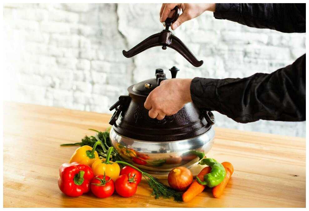 Безопасность эксплуатации и особенности использования: Эксплуатационные характеристики требуют строгого соблюдения мер безопасности, особенно при работе с клапанами сброса давления. Пользователи отмечают необходимость постоянного визуального контроля за клапанами во время приготовления для предотвращения превышения давления. Технические параметры работы предполагают точное определение времени приготовления для разных продуктов - превышение временных параметров приводит к появлению горького привкуса в блюдах. Особенностью является образование конденсата из жиров и других веществ, которые могут оседать на кухонной вытяжке и поверхностях, что делает предпочтительным использование на открытом воздухе. При хранении может образовываться белый налет на дне, идентифицируемый пользователями как оксид алюминия, что требует повторного прокаливания перед использованием после длительного перерыва. Процедуры очистки осложняются крупными габаритами изделия, вызывающими разбрызгивание воды в стандартных раковинах, а также необходимостью полного высушивания после мытья для предотвращения коррозии.