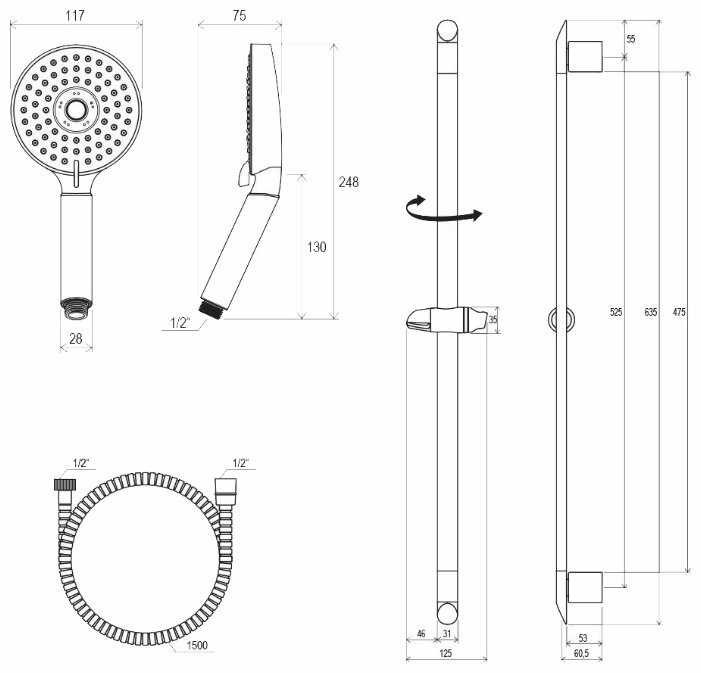 | Дополнительная информация : | высота стойки для душа: 630 мм, диаметр душевой лейки: 117 мм |