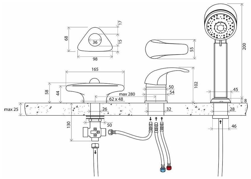| Комплектация : | дивертор, лейка, смеситель, шланг |