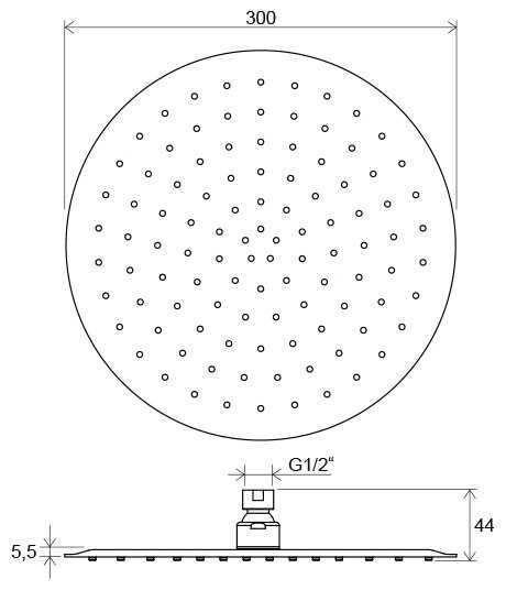 - + Верхний душ круглой формы с массажными форсунками диаметром 300мм. Изготовлен из нержавеющей стали с хромовым покрытием.