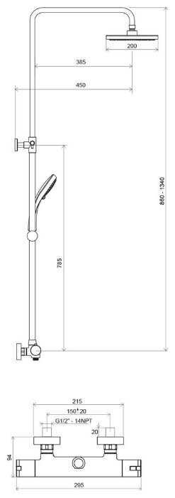| Дополнительная информация : | высота стойки для душа: 1340 мм, диаметр верхнего душа: 200 мм |